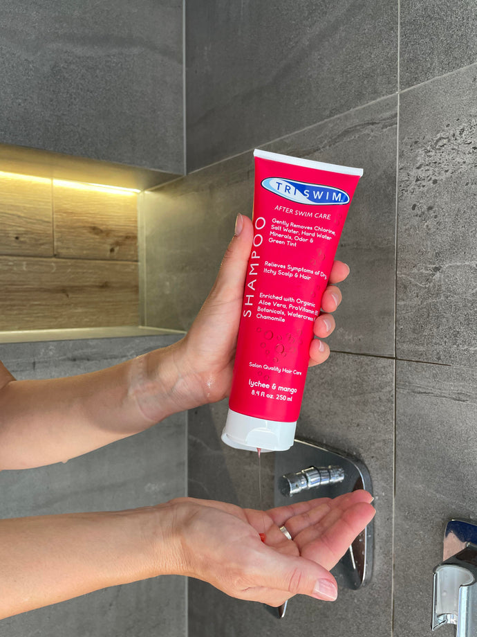 TRISWIM Shampoo is for anyone who loves to swim but dislikes the negative effects of Chlorine and saltwater have on the hair. The invigorating Lychee & Mango scented Shampoo formula gently removes Chlorine, Salt Water, Hard Water Minerals & Pool Chemicals odor while nourishes hair with botanicals